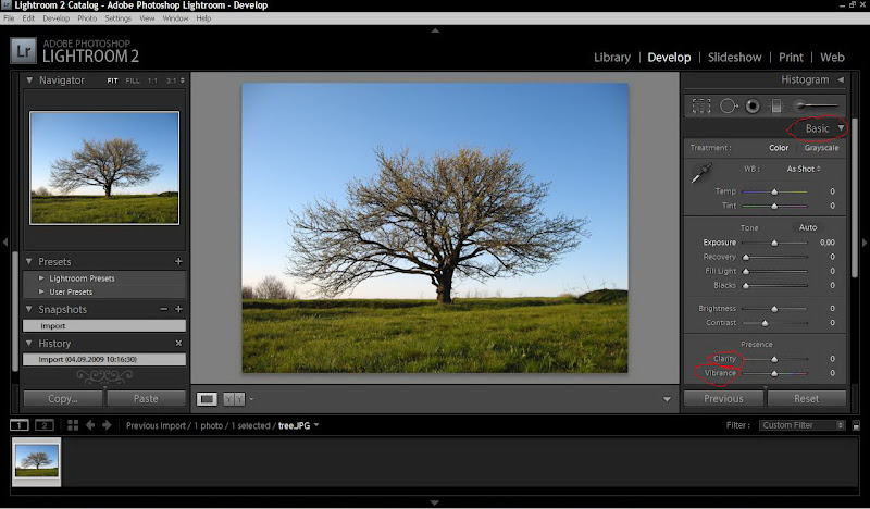 Нажимаем выпадающую вкладку — Basic и добавляем четкость (Clarity) примерно +50 и усиливаем второстепенные цвета (Vibrance) +25.