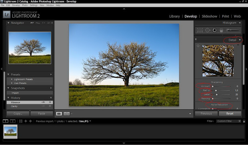 Во вкладке Detail добавляем резкость к снимку — Amount 40; Radius 0,8; Detail 50; Masking 0.