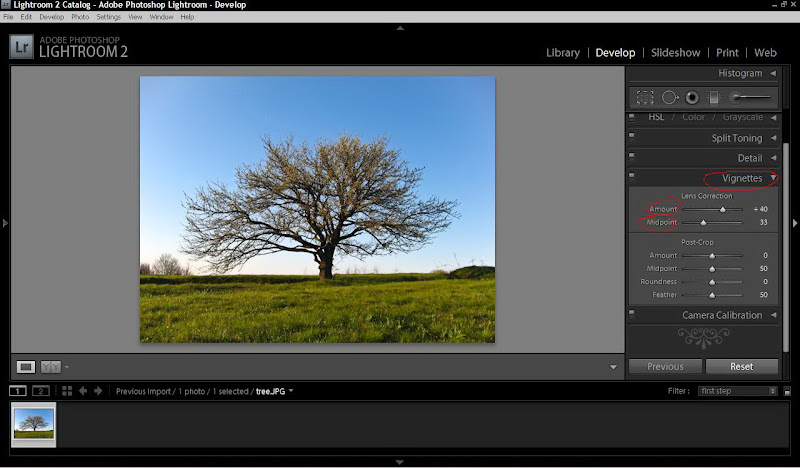 Теперь, наша задача заключается в осветлении уголков фотографии, которые наш фотоаппарат затемняет (виньетирование). На вкладке Vignettes в Lens Correction ползунок Amount тащим вправо, а ползунок Midpoint, влево, до достижения визуального удовлетворения.