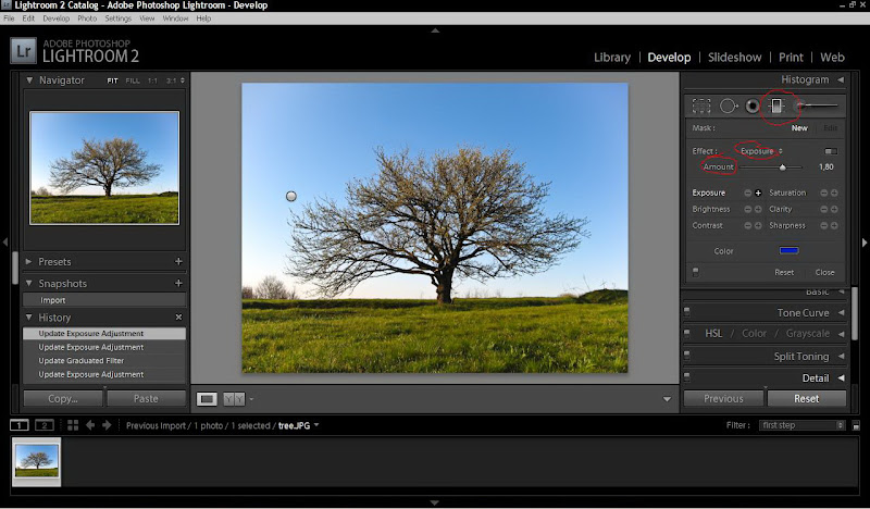 Если какая-то часть фотографии была затемнена или, наоборот, сильно переосвещена из-за неправильного или плохого освещения, в программе реализован инструмент, помогающий осветлить или затемнить некоторые участки фотографии. В этом поможет инструмент, вызвать который можно нажав кнопочку, обведенную красным на нижней иллюстрации. Предупреждаю, что этот инструмент рассчитан на настоящих маньяков-фотопрофессионалов, поэтому можете пользоваться этим инструментом на свой страх и риск. Что делать писать не буду, разбирайтесь сами. Скажу только, что необходимо выбрать область фотографии и при помощи ползунка — Amount, добиться необходимого результата.